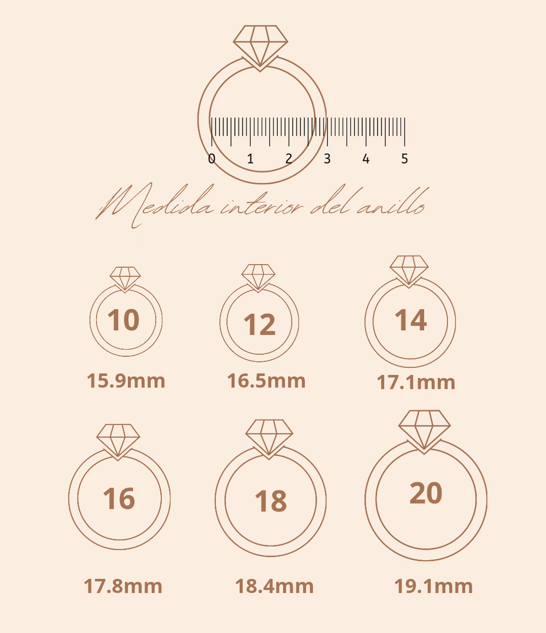 Con los milímetros que obtengas, consulta nuestra tabla de tallas y encuentra tu talla ideal. De esta manera, te asegurarás de que tu anillo se ajuste cómodamente y luzca perfecto. A tener en cuenta. La tempertura puede influir en el tamaño de tus dedos. Con el calor, los dedos tienden a hincharse ligeramente, mientras que con el frio pueden encogerse un poco. Consejo: si dudas entre dos tallas, suele ser más cómodo elegir una talla mayor.